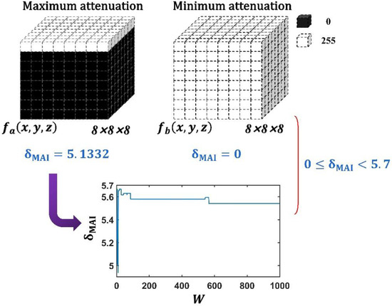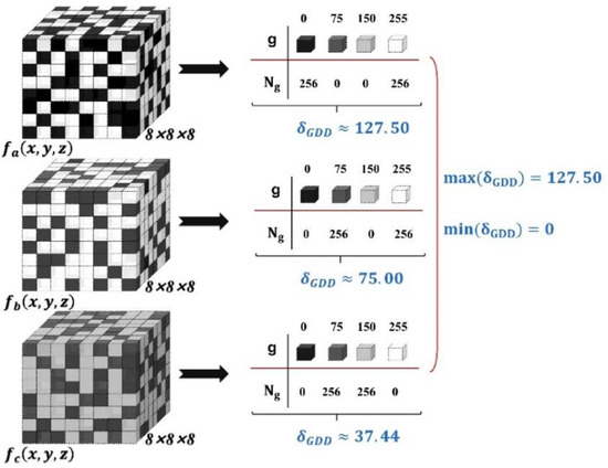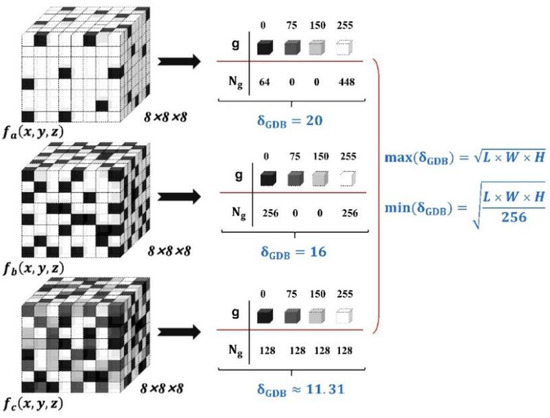 where G represents the number of gray levels, is the number counted when the number of gray levels is g, and L, W and H are the length, width and height of the 3D OCT image. GDB implies the coverage degree of the gray level number. The principle of GDB is shown in Figure 5. The size of the 3D image is 8 × 8 × 8 voxels. There are different breadths of gray level distribution in , and Additionally, the wider the gray level contained in the OCT image and the more uniform the distribution, the smaller the value of GDB.