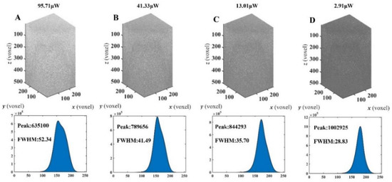 When the power of the reference arm is set as 95.71 μW. Silica gel phantoms with different sizes and mass fractions of scatterers (Titanium dioxide, TiO2, Shanghai Macklin Biochemical Co., Ltd., Shanghai, China) were imaged. The preparation process of the silica gel sample is briefly as follows, type AB liquid silica gel is mixed in a ratio of 1:1 and TiO2 particles are added as a scattering agent. After being fully stirred, the mixture is poured into a Petri dish. Air bubbles are removed in a vacuum chamber. Four types of phantoms were made with TiO2 particles. Scatterer parameters and OCT images with the histograms of the phantoms are shown in Figure 9. It shows the phantom without particles had the lowest FWHM and the largest peak. The content decrease for particles of the same size will reduce FWHM, and the corresponding peak will increase. This means that the sharper gray level distribution may have less useful information. Larger-sized particles increase FWHM and peak.