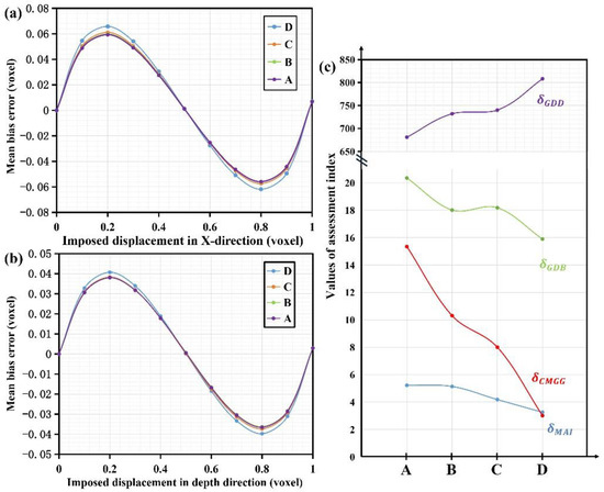 The displacement obtained by the DVC method is compared with the applied displacement to evaluate the influence of CMGG on the calculation results. The mean bias error () is used to evaluate the error in calculating displacement.