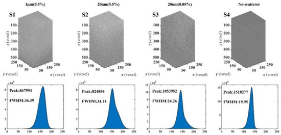 Three-dimensional OCT images of silica gel phantoms with different sizes and mass fractions of scatterers and their corresponding histograms of phantoms. S1: 1 μm(0.5%), S2: 20 nm(0.5%), S3: 20 nm(0.05%), S4: No scatterer.