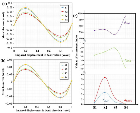 Virtual deformation was applied similarly to Section 3.1. The DVC calculated displacements. Figure 10 shows the mean bias errors of the displacement and the image quality indices. Figure 10a,b show that the mean bias errors of sub-voxel displacement in the depth direction are overall lower than those in the X direction. Figure 10c shows that the mean bias errors of the sub-voxel displacement in the depth direction and X direction of the OCT image will increase with the decrease in CMGG. It can be seen that when the value of CMGG is the largest, S2 has the smallest mean bias error along the X direction and depth direction. When the value of CMGG is the smallest, S4 has the smallest mean bias error along the X and depth directions. CMGG of S3 is greater than S1, and the mean bias errors of S3 along the X direction and depth direction are less than S1. A single OCT image quality evaluation parameter cannot express the above phenomenon. The Pearson correlation coefficient for and the mean bias errors of displacement was −0.875** Sig. (two-tailed) < 0.01, showing a significant negative correlation.
