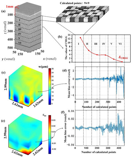 Figure 8a and Figure 10a show that the mean bias errors change sinusoidally with the sub-voxel displacement, which is due to the sub-voxel interpolation of gray value and gray value gradient [36]. The amplitude comparison of the sinusoidal curve can distinguish the calculation error caused by the image quality. However, the OCT image quality standard cannot evaluate speckle decorrelation when large deformation occurs. As shown in Figure 10, CMGG seems to be a useful tool for DVC measurement based on OCT images when decorrelation can be avoided or ignored.