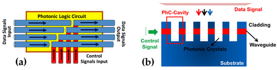 This work numerically investigates all-optical switching actions for near-infrared communication. The switching mechanism is implemented in 2D PhC structure, where an out-of-the-plane coupled data signal is amplified with an index-guided control signal. Moreover, presents a novel concept in terms of bringing the out-of-the-plane and index-guided signals together, which investigates an easy-to-implement optical switch design. Apart, from these, it offers the advantage to be used in different optical components i.e., optical filters, transistors, modulators, and logic gates [39]. The symmetric condition of the arrangement is another advantage of the research, as the change in the radius of the cavity, will bring a considerable change in the tunning of the GMR modes rather than having cavities on both sides of the structure as compared to the already presented investigation in [40]. A conceptual diagram representing the basic working of the optical switching device integrated into the photonic logic circuit is shown in Figure 1a, where a 4-bit bus carrying a data signal is optically switched using 4-bit control signals. A low-index contrast dielectric material-based slab-waveguide PhC structure is used to make the device compatible with fiber optic communication. A waveguide material based on Niobium pentaoxide (Nb2O5) is deposited on a silicon dioxide (SiO2) glass substrate as an optical membrane and covered with a SiO2 cladding layer as presented in Figure 1b. The refractive indices of Nb2O5 and SiO2 for the NIR range are implemented as nw = 2.2 and ns = 1.5 respectively, which are taken as a reference from experimental results presented in [12,41]. The optical switching action is optimized by varying the size and position of the PhC nano-cavity and the number of PhC-elements. The proposed investigation presents a cost-effective, compact, and easy-to-fabricate device based on dielectric materials suitable for a broad spectral range, unlike semiconductor material based devices investigated in [4,10,19,24], which can have limitations being bulky, expensive and difficult to fabricate designs.