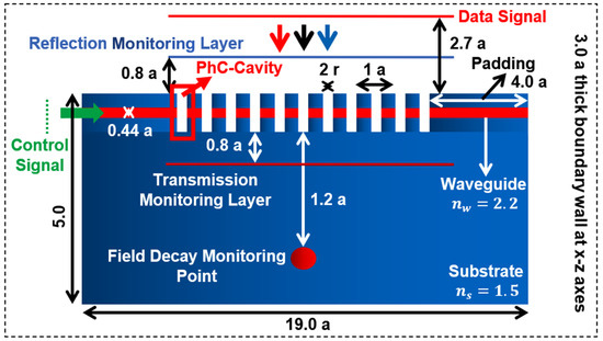 The optical switching action is investigated using 2D-FDTD simulations in an open-source software platform, the so-called MIT Electromagnetic Equation Propagation (MEEP) [42,43]. The time-domain simulations in MEEP compute the electric and magnetic fields by solving Maxwell’s equations [41]. The FDTD offers the advantage to use a short Gaussian pulse to compute the response of the system over a wide frequency range. The pictorial representation of the simulation domain is shown in Figure 2a where the multilayer structure with a waveguide layer submerged between the substrate and cladding layer can be seen. A plane-wave source above the structure indicates the data signal, which is coupled into the PhC structure, where it is filtered by GMR. To implement the optical switching mechanism, a control signal (shown on the left) is index-coupled into the waveguide. The date signal is monitored above and below the waveguide as reflection and transmission flux as indicated in the figure. The simulation cell is terminated using Perfectly Matched Layer (PML) boundary conditions to absorb all the outgoing EM fields in both X and Z-directions. While Figure 2b presents the real investigated structure comprising of a variable PhC-cavity at the start of the structure. Figure 2c is the zoomed image of the PhC-cavity, showing its geometrical parameters in terms of radius, depth of the PhC-hole and thickness of the cladding layer. Moreover, the radius of the PhC-cavity is varied to investigate its effects on the resonant wavelength in cylinderical PhC-elements. However, since this work is based on 2D-FDTD simulations, the shape of these air-hole based PhC-elements appear to be rectangular gratings.