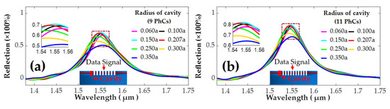 To investigate the optical amplification and switching mechanism, a PhC cavity is placed at the start of the structure. Initially, the radius of the PhC cavity is varied for different periods of PhC elements to study its effect on the data signal. The radius of the cavity is varied from rc = for the number of PhC-elements as and in reflection spectra as shown in Figure 6, with an inset showing the zoomed image of the difference between the peaks.
