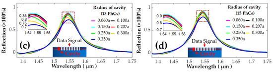 The variation in the radius of the PhC cavity at the start of the membrane shifts the to a noticeable range. As the radius of the cavity increases, undergoes a blueshift and vice versa. This the because the drop in fill factor results in a decrease in the effective refractive index of the periodic waveguide and a drop in the coupling of the energy into the membrane. Similarly, when the radius of the cavity is slightly lower i.e., 0.150a as compared to the radius of the PhC elements used in the arrangement i.e., , the quality of the spectrum is maximum in terms of reflection peak and linewidth. Correspondingly, by increasing the radius of the cavity further to , the undergoes a redshift and the coupling of energy starts to decrease abruptly. Figure 6a depicts output spectra of the 9 PhCs-based structure with varying cavity-radius for data signal, where the reflection peaks are lowest as compared to other cases. Whereas, Figure 6b depicts the reflection spectra for 11 PhC periods showing an increase in the values of the reflection peaks and coupling of energy into the optical membrane. Figure 6c shows an increase in the reflection peak values where the radius of cavity is varied for 13 periods of PhCs. Figure 6d displays the highest values of the reflection peaks for cavity-radius variation in 15 periods of PhCs. Additionally, the position of the cavity was checked on both lateral ends of the membrane which yielded the same results.