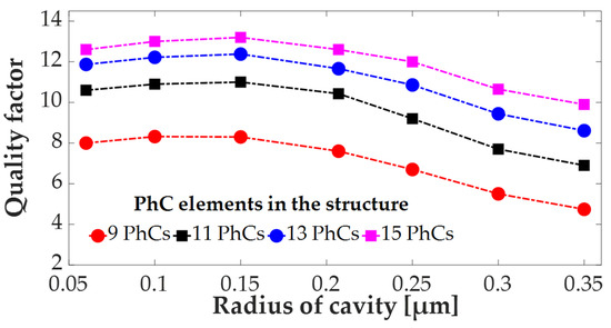 The quality factor of resonant modes for a varying number of PhC-elements is shown in Figure 8. The quality factor is calculated for cavity-radius in the range of r = 0.06a to 0.35a for 9 to 15 PhC-elements. It can be observed that the highest quality factor is achieved for 15 PhC-element-based structures regardless of the cavity-radius selection, which indicates a better field coupling and confinement in larger number of PhC-elements. Moreover, it can be seen that the quality factor is highest for cavity-radius value of r = 0.15a in all the cases ranging from 9 to 15 PhC-elements. It drops rapidly as the cavity-radius exceeds r = 0.15a. The reason can be explained as the drop in fill-factor as the radius of the PhC-elements increases which results in a drop in the value of the effective refractive index of the waveguide.
