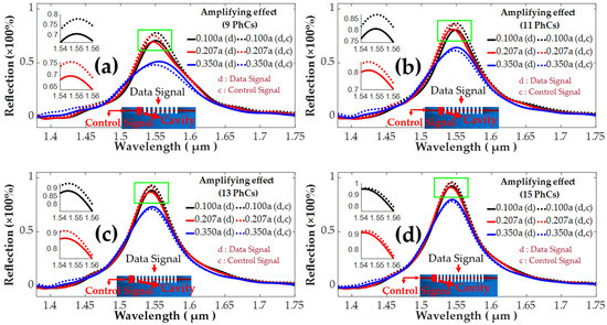 After investigating the effects of the cavity-radius and number of PhC-elements on spectral properties of the device using a data signal, the next step is to implement the control signal to study the optical switching action. The goal is to choose the values of structural design parameters in such a way that the control signal must interference and significantly amplify a weak data signal to perform an optical switching action. The reflection spectra for variation in cavity-radius for different numbers of PhC-elements using both data and control signal are shown in Figure 9. To visualize the optical amplification, the reflection spectra for the data signal is plotted with a solid line, whereas, the reflection spectra for both data and control signal is plotted with a dotted line. Insets in the Figure 9a–d show a zoomed view of the reflection peaks.