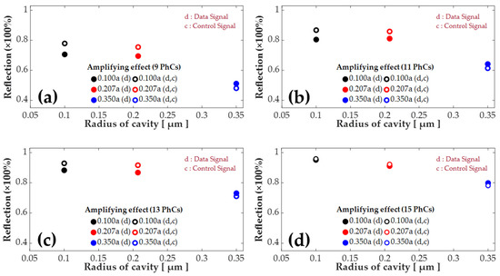To give a more detailed insight into the optical switching action, the values of reflection peaks are plotted against the cavity-radius for all four cases of a varying number of PhC-elements (Figure 10). The reflection peaks for a single source (the data signal) are shown in solid circles, whereas, the reflection peaks of the data signal after turning on the control signal are shown with hollow circles. All the three considered cavity-radii values are depicted in different colors. It can be concluded from the graphical analysis that the best optical switching and amplification effect can be achieved with the device having 9 PhC-elements and cavity-radius as r = 0.10a.