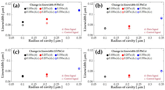 To investigate the bandwidth and quality of the resonant modes, a comprehensive study on variation in the linewidth of the resonant modes for the change in structural parameters and implementation of the optical switching action is discussed in this section. The graphical representation of the linewidth against the cavity-radius for all of the four PhC based structures are investigated with the effects of the control signal on the output of the data signal, the approach in reflected in Figure 11a–d. For all the considered cases, the overall variation of linewidth is from 0.069 to 0.100 µm. As a generalized trend for optical switching, the linewidth of the data signal is decreased after the application of the control signal. Whereas, the minimum value of linewidth and the smallest difference of linewidth of the data signal after application of the control signal is achieved for 15 PhC-elements (Figure 11d). As explained earlier, the more the number of PhC-elements, the better the coupling and confinement of energy into the periodic structure. The case study in Figure 11a, with 9 PhC-elements offers the largest linewidth of the modes and a larger difference in linewidth of data signal without and with the application of the control signal. It can be concluded here that for better optical filtering and field confinement characteristics, a larger number of PhC-elements is preferred would yield a narrow linewidth and a better-quality factor. Whereas, for optical amplification and switching effect, a structure with lesser number of PhC-elements is preferred which would yield a broader linewidth.