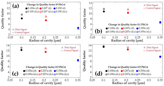 To evaluate the spectral characteristics of the designed optical switching device, a comparative analysis of the quality factor of the resonant modes is graphically presented in Figure 12. It can be observed in all the subplots (Figure 12a–d) that the quality factor of the data signal is improved with the application of the control signal which largely justifies the device design for optical switching action. The highest quality factor is achieved for the structures with 15 PhC-elements and cavity-radius of 0.100a and the lowest quality factor of 9.74 is achieved for 9 PhC-elements and cavity-radius of 0.305a. In addition to this, the 9 PhC-elements arrangement offers the largest value of quality factor improvement in data signal when the control signal is applied which again adds to the quality of optical switching offered by the device. Summarizing, the quality factor improves to 11.87 for 11 PhC elements, 13.23 for 13 PhC-elements, and 13.80 for 15 PhC-elements. The different number of PhC-elements and cavity-radii shown in Figure 12a–d, gives the user a wide range of quality factor selection making the device suitable for different optical amplification and switching scenarios.