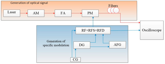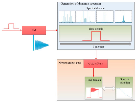 As shown in Figure 1, Radio-frequency (RF) signals with gradually changing amplitude and pulse optical signals are loaded into a Phase modulator (PM) respectively, where blue represents electrical signals and red represents optical signals. The spectrum is controlled by specific phase modulation, and the bandwidth changes dynamically, but the time domain signal has not changed. Then, affected by the GVD effect, the change of FM-to-AM effect is amplified and highlighted; finally, the pulse signal with gradually changing FM-to-AM depth is obtained. Subsequently, we indirectly measure this rapid changeable spectral distribution based on the mapping relationship between frequency and time domain. Generally, based on the physical requirements, we adopt nanosecond optical pulses in the front-end system of a high-power laser driver. Therefore, the time width of the specific modulation signal in this paper is also limited to the nanosecond level and the modulated signals with smaller time width and shape-controllable can also be obtained in our proposed scheme, but it is not considered in this current experimental system.