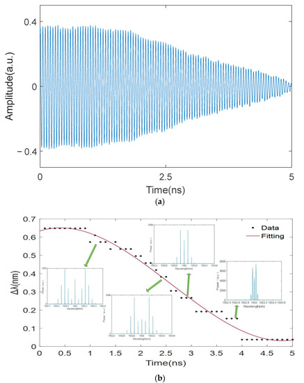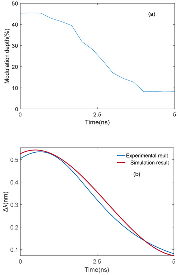 Then, following the proposed method, the change trend of FM-to-AM depth within 5 ns after specific phase modulation can be obtained and shown in Figure 7a. The same corresponding trend of spectral width with time variation curves can be indirectly obtained based on the mapping relationship between frequency and time domain because they both vary with m(t). Combining with the calibrated maximum spectral width, the measured experimental result of dynamic variable spectral width with a range from approximately 0.5 nm to 0.1 nm is plotted in Figure 7b, which is well consistent with the simulation.