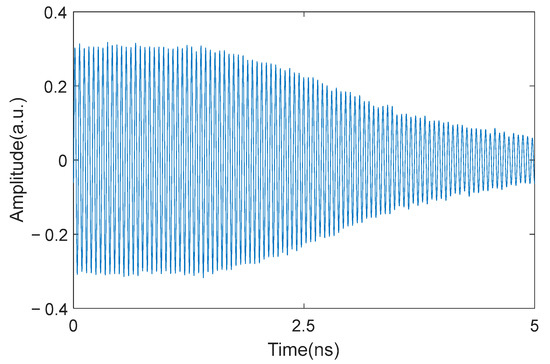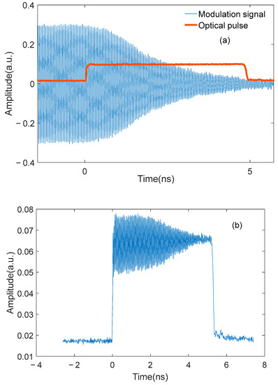 Secondly, the calibrated specific modulation signal is loaded on the optical pulse with a center wavelength of 1053 nm and pulse width of 5 ns. The synchronous display diagram between the optical pulse and modulation function is shown in Figure 6a. Since the dynamic change of spectrum in the nanosecond scale is difficult to be measured in the experiments; we put forward to establishing the mapping relationship between frequency and time domain to indirectly measure and quantify the dynamic variable spectral distribution. Thus, in order to measure this change in the time domain, we add 100 m transmission fiber after PM output to increase FM-to-AM effects caused by GVD. As shown in Figure 6b, the output signal in the time domain is measured by a high-speed photo-detector with a bandwidth of 45 GHz and an oscilloscope with a bandwidth of 30 GHz.