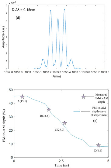 In addition, to further verify the effectiveness of the experimental method, a complementary experiment is designed to compare whether the FM-to-AM depth calculated by different spectral widths meets the trend shown in Figure 7a. We directly measure the time domain curve after phase modulation and 100 m fiber length to obtain the FM-to-AM depth of four different spectral widths. Four kinds of spectral widths and corresponding modulation curves are calibrated respectively, which are marked as A (0.53 nm); B (0.44 nm); C (0.30 nm); D (0.15 nm), mainly due to the diverse modulation index. As shown in Figure 8e, the FM-to-AM depth measured by these four modulation curves is indeed consistent well with the experimental results. Consequently, the further mutual assessments between the time and frequency domains make the proposed method feasible.
