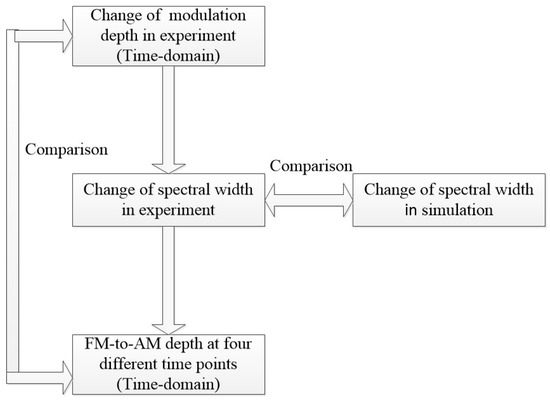 Based on the mapping relationship between the frequency and time domain, we indirectly measure the dynamic variable spectral distribution and establish mutual assessments and verification schemes. The complete verification strategy is shown in Figure 9, which includes comparing spectral widths obtained by indirect measurement and simulation calculation, and comparing it with the FM-to-AM depth obtained by experimental measurements, respectively. Among them, the measured four depths are recorded after phase modulation and 100 m fiber length.