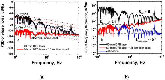 A comparison of the phase noise and frequency fluctuation power spectral density (PSD) obtained for a DFB laser in conventional and hybrid configurations is shown in Figure 4a,b. The measurements were carried out for a frequency range of more than 10 kHz, since for that, the influence of environmental and temperature noises is significantly reduced.