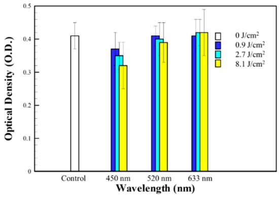 Viability assay of human fibroblast cells in the absence of LLLT (control group) and after LLLT with fluences of 0.9, 2.7, and 8.1 J/cm2 at 450, 520, and 633 nm, respectively.
