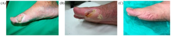 (A) A complicated wound of the right foot significantly improved with treatment (B) after 633 nm LLLT in 4 weeks, and (C) the final result was observed in 6 months.