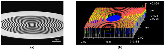 For the manufacturing of the subwavelength diffractive optical element, technologies including lithography, chemical etching, and a lift-off process were used. Quartz was used as the substrate of the future element. The surface roughness was less than 10 nm. A metal film was deposited onto a quartz substrate using a CarolineD12A magnetron deposition system (ESTO-Vacuum, Inc., Moscow, Russia). The metal layer was formed during the deposition of aluminum at a vacuum pressure of 10−3 Pa and a power of 300–700 W. The thickness of the aluminum film was controlled by the deposition time and amounted to 50 nm. Next, a resist for electron-beam lithography was applied in a centrifuge. The thickness of the deposited resist was 400 nm (monitored on a P-16 profilometer (KLA-Tencor, Inc., Milpitas, CA, USA)). The exposure of the resist was performed with a SEM microscope with a resolution of 10 nm. The remaining mask was then chemically removed from the resist. The resulting structure was cleaned and baked to increase adhesive properties. A thin chromium film was deposited by a CarolineD12A magnetron sputtering machine (ESTO-Vacuum, Inc.). The deposition took place at the following parameters: 700 W and 10−3 Pa. The film thickness was 45 nm. Further, a lift-off process was used. The resist was removed by acetone along with the chromium film on it. This made it possible to obtain a negative mask in chromium compared with the mask on the resist. The metal layer was removed through the chromium film with NaOH. At the last stage, the chromium mask was removed by potassium hexacyanoferrate (III) (K3[Fe(CN)6]) for 10 min. The image of the manufactured lens obtained by a SEM microscope is presented in Figure 1a. To check the fabrication quality and parameters of the manufactured element, an optical white light interferometer (“Zygo New View 7300”) was applied. The sizes of the analyzed area were 35 μm × 26 μm and the optical zoom was 200×. The relief height of the lens was 50 nm. The results of measurement are demonstrated in Figure 1b.