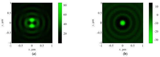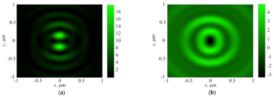It can be seen from Figure 2 and Figure 3 that the distributions of the intensity and the Umov–Poynting vector longitudinal component in the plane of the focus were ring-shaped: asymmetric for the intensity (Figure 2a) and symmetric in the case of the Umov–Poynting vector longitudinal component (Figure 2b). In this case, negative values were observed in the center of the ring formed by the Umov–Poynting vector longitudinal component (reverse energy flow). The asymmetry of the intensity ring was caused by the uneven contribution of individual intensity components to the formation of this ring; the longitudinal component (Figure 3b) formed the top and bottom of the ring (it had the form of two peaks located along the y-axis), and the transverse component formed the right and left parts of the ring (it had the form of three peaks located along the x-axis). In this case, it was the transverse component of the intensity that was nonzero on the z-axis (Figure 3a).
