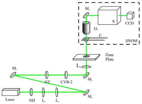 The experimental setup. Laser is the LCM-S-111-20-R (50 mW, 532 nm); ND is a neutral density filter; L1, L2, and L3 are lenses with a focal distance of f1 = 35, f2 = 100, and f3 = 10 mm, respectively; M1, M2, M3, and M4 are mirrors; GT is the Glan–Taylor prism; CVB-2 is a polarization converter (Thorlabs WPV10-532); C is a cantilever with a diameter of 100 nm (SNOM_C, NT-MDT); S is a spectrometer (Solar TII, Nanofinder 30); O1 is a 100× objective lens (100× Mitutoyo Plan Apo Infinity Corrected Long WD Objective); CCD is a CCD camera (Andor, DV401-BV).