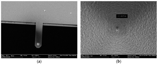 The SNOM cantilever had the form of a hollow pyramid made of a thin aluminum layer with an aperture at the top. The hole size was about 90 nm. The SEM image of the used cantilever is presented in Figure 7. The transverse scanning of the focus area was carried out with a precision of 35 nm.