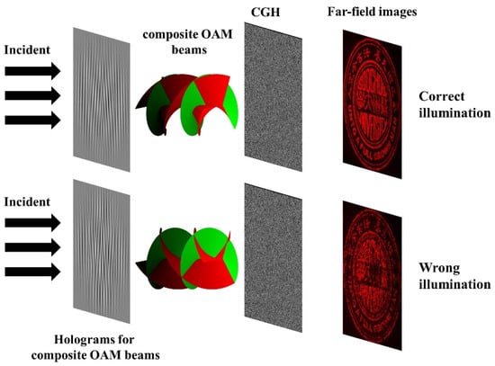 A schematic diagram of composite OAM phase holography is shown in Figure 1. An incident beam with the expected OAM beam illuminates the CGH phase pattern, and the holographic image can be reconstructed clearly. Conversely, if the CGH phase pattern is illuminated with the wrong beam, the noise becomes too high and blurs the image.