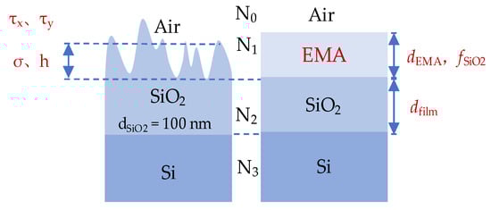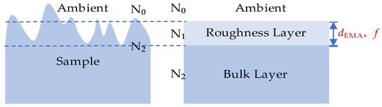 When ellipsometry is used to invert the optical constants of an object, the equivalent medium approximation (EMA) is often used to represent the ellipsometry response of the surface topography [,,,]. In the equivalent medium approximation model, the rough surface is equivalent to a new film, and its ellipsometric response is the same as the original surface. This film is a smooth film with only one medium, which is uniformly distributed in this layer, as shown in Figure 2. The equivalent thickness dEMA and the void volume fraction f are usually used to represent the geometric and optical properties of this new film.