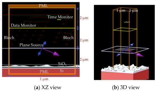 The position and simulation size of each component are introduced in detail, as shown in Figure 3. In the near-field simulation, the spacing between components needs to be greater than at least one wavelength range. Since the ellipsometric parameters need to be simulated in a wide spectral range under 400–1000 nm, the z-axis distances between the upper PML boundary and the data monitor, the data monitor and the light source, the light source and the substrate Si surface are all set to 2 μm, and the simulated boundary ranges in the x and y directions are all set to 1 μm.