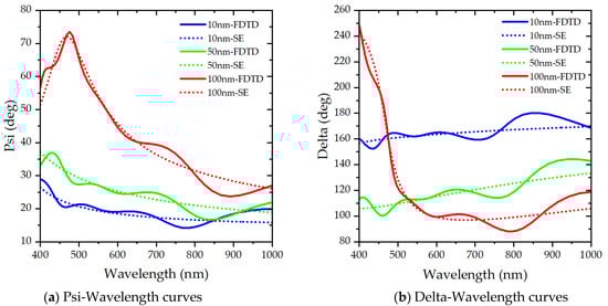 The finite difference time domain (FDTD) method has been developed with FDTD Solutions which is an electromagnetic wave simulation software based on the solution of Maxwell’s equations []. It has the characteristics of intuitive graphical interface, simple parameter design, and powerful simulation capabilities []. It is widely used in the cutting-edge research based on electromagnetic fields, which can calculate the distribution of electromagnetic fields at different positions in space at different times without considering the shape constraints of materials [,,]. Based on this, the FDTD method can be used to calculate the ellipsometric parameters of rough surfaces with arbitrary topographic feature parameters [,]. In this work, FDTD Solutions is used to calculate the ellipsometry response of the surface topography, and for the single factor analysis of different topographic feature parameters.