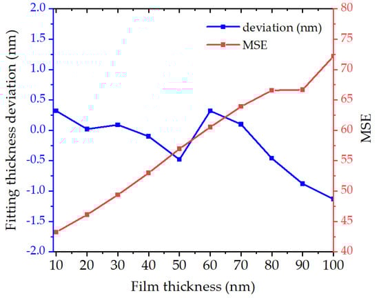 Fitting Thickness deviation and MSE of FDTD simulated smooth thin films of SiO2 film with thickness of 10–100 nm on silicon substrate under the 65° incident angle.
