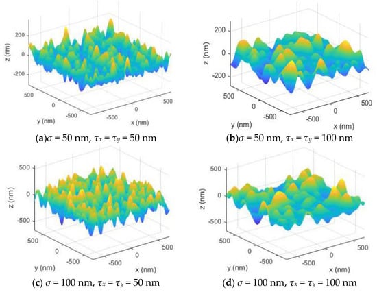 When the 2D random rough surface does not consider the preferential roughness direction, it is equivalent to the isotropic rough surface. Figure 6 shows a Gaussian random rough surface with different rms heights and correlation lengths. When the height average h is 0, the roughness of the surface depends on the two parameters σ and τ. The smaller σ or the larger τ, the smoother the surface, and vice versa.