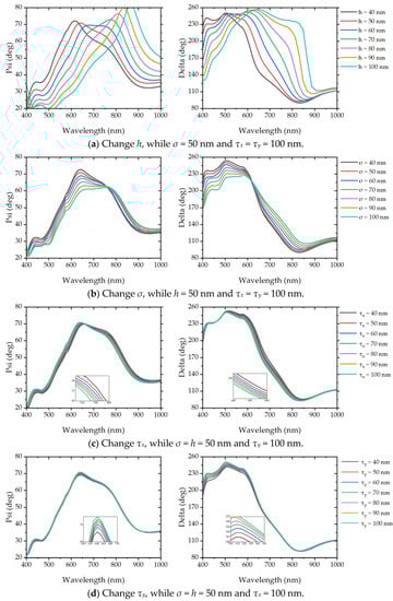 The ellipsometry parameters for a 65° incidence angle in the wavelength range 400-1000 nm of the rough surface defined by the topographic feature parameters can be obtained by FDTD Solutions. Figure 7 shows the ellipsometric parameters of rough films under different surface topography characteristic parameters. Each topographic feature parameter was varied from 40 nm to 100 nm with 10 nm intervals. It can be seen that the topographic feature parameters such as the average height h, the root mean square height σ, and the correlation lengths τx and τy have a significant impact on Δ, and have little impact on Ψ. Under the same variation scale, the numerical offsets of the four topographic parameters to Ψ and Δ are also different. The topographic parameters corresponding to the offset order from large to small are: average height h, the root mean square height σ, and the correlation lengths τx and τy.