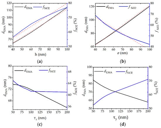 Figure 9 shows the fitting results of the ellipsometric parameters of the FDTD simulated rough films under different morphological parameters. It can be seen that the average height h, the root mean square height σ, the correlation lengths τx and τy all affect the values of the dEMA and fSiO2 parameters in the construction of the equivalent medium model, and they are all approximately linearly related, but the influencing coefficients are different.