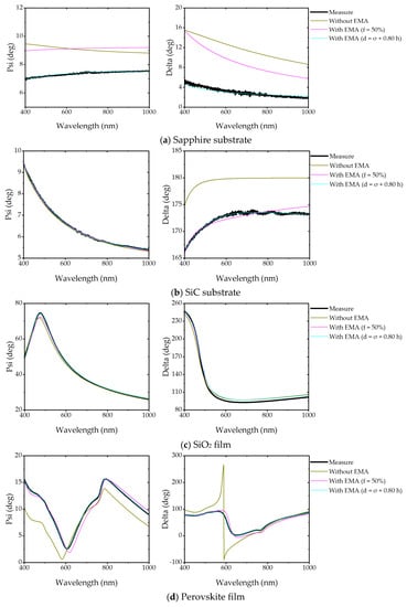 Fitting curves of measured ellipsometric parameters and without EMA layer and with established EMA layer. (a,b) represent bare sapphire and bare silicon carbide substrate, respectively; (c) represents silicon substrate with silicon oxide thin film; (d) represents perovskite thin film deposited on the sapphire substrate.