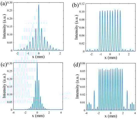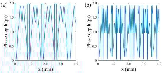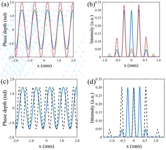 The operation principle of this type of holograms is illustrated in the Figure 1. The two sinusoid phase profiles shown in Figure 1a have the same period and different amplitudes, i.e., values of . It can be seen from their corresponding spot profiles shown in Figure 1b that the difference in the amplitudes leads to a variation in the power distribution within the generated spot array. However, the pitch between the spots is identical. Figure 1c shows two sinusoid phase profiles with the same amplitude but different periods, i.e., T values. The period within the solid blue phase pattern is twice of that within the dark dashed one. The corresponding spot profiles illustrated in Figure 1d show the same power distribution between the generated spots. However, the pitch of the spots in the dark dashed line is twice of that in the solid blue line.