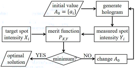 In this scheme, the number of variables for the optimization was proportional to the number of spots within the target array instead of the number of pixels within the holograms. As a result, the number of variables that require optimization was significantly reduced. This enabled the use of the standard small-scale optimization algorithm for the automated generation of the value of each sinusoid function. The flow chart of the optimization process used in this work was shown in Figure 3. This iterative process was carried out based on the standard gradient descent algorithm.