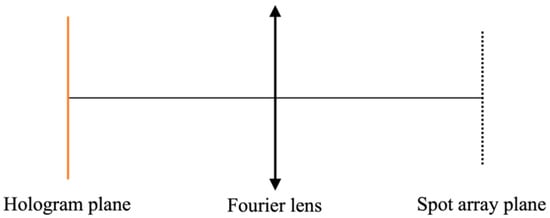 In order to evaluate the feasibility of the proposed method, a simulation was carried out to generate 1 × 9 and 1 × 15 spot arrays, respectively. Figure 4 showed the general optical architecture used in the simulation. The Gaussian beam waist on the hologram plane was set as 1.08 mm. The wavelength of the beam was set as 1550 nm. The hologram was placed at the front focal plane of a Fourier lens with a focal length of 154 mm. In this way, spot arrays can be generated at the back focal plane of the Fourier lens. The base period of the sinusoid functions was always set as 0.88 mm. In this setup, the generated spots can be closely packed but without interfering with each other. The specification of the LCOS device for the display of the hologram was set based on the actual device used in the experiment. It has a pixel size of 8 µm. A Gaussian filter with a 1/e width of 8 µm was applied to the displayed holograms to emulate the fringing field effect of the LCOS device.