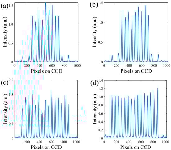 In the experiment, the initial holograms were generated through the simulation process, which was described in the above. Therefore, the spot array generated by the initial hologram can be closer to the target profile, potentially leading to a faster optimization process. Nevertheless, there still would be some discrepancy between the simulation and experiment since the simulation cannot cover every aspect of the actual optical system, including the misalignment of the optical system, manufacturing errors within the lens, depolarization effect and the phase flicker within the LCOS device, etc. It should be noted that the impact of the depolarization effect of the LCOS device was particularly strong, especially when a large spot array was required. In this case, the intensity of the central spot within the array would be higher than expected. As a result, the target intensity of the central spot was intentionally suppressed for the initial hologram generation through the simulation. During the experimental optimization process, the target intensity level of each spot within the array can be modified adaptively based on the progress of the optimization. Figure 9a,c showed the cross section of 1 × 9 and 1 × 15 spot arrays generated by the initial holograms, respectively. The corresponding results after the optimization were shown in Figure 9b,d. The 2D profiles were shown in Figure 10. For both 1 × 9 and 1 × 15 spot arrays, the non-uniformity was less than ±8%.