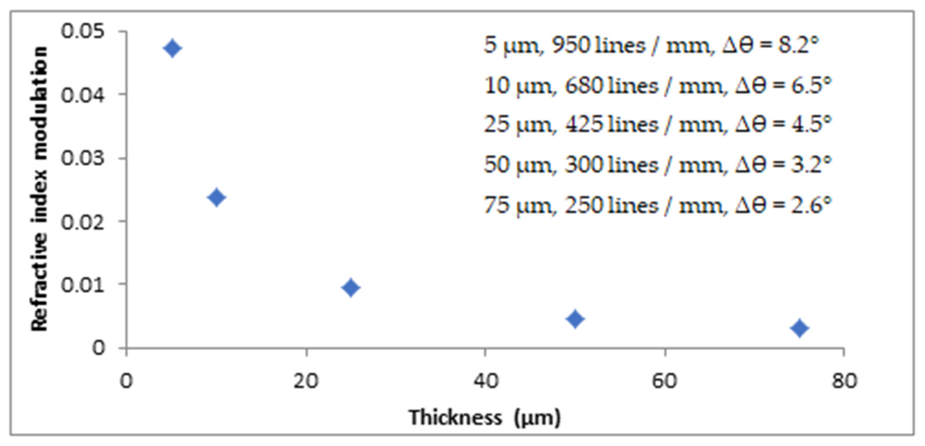 - Wang, H.; Wang, J.; Liu, H.; Yu, D.; Sun, X.; Zhang, J. Study of effective optical thickness in photopolymer for application. Opt. Lett. 2012, 37, 2241–2243. [Google Scholar]