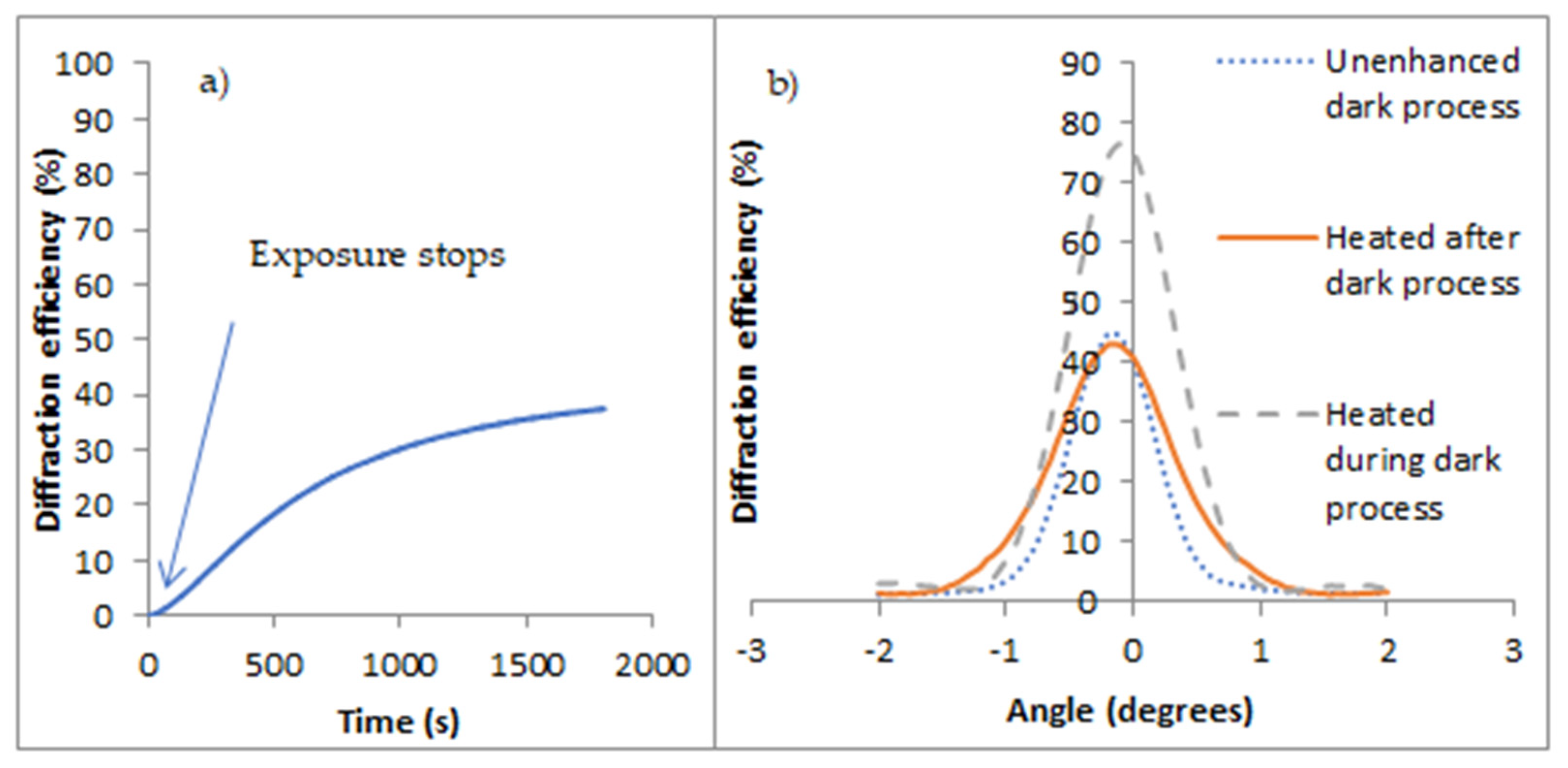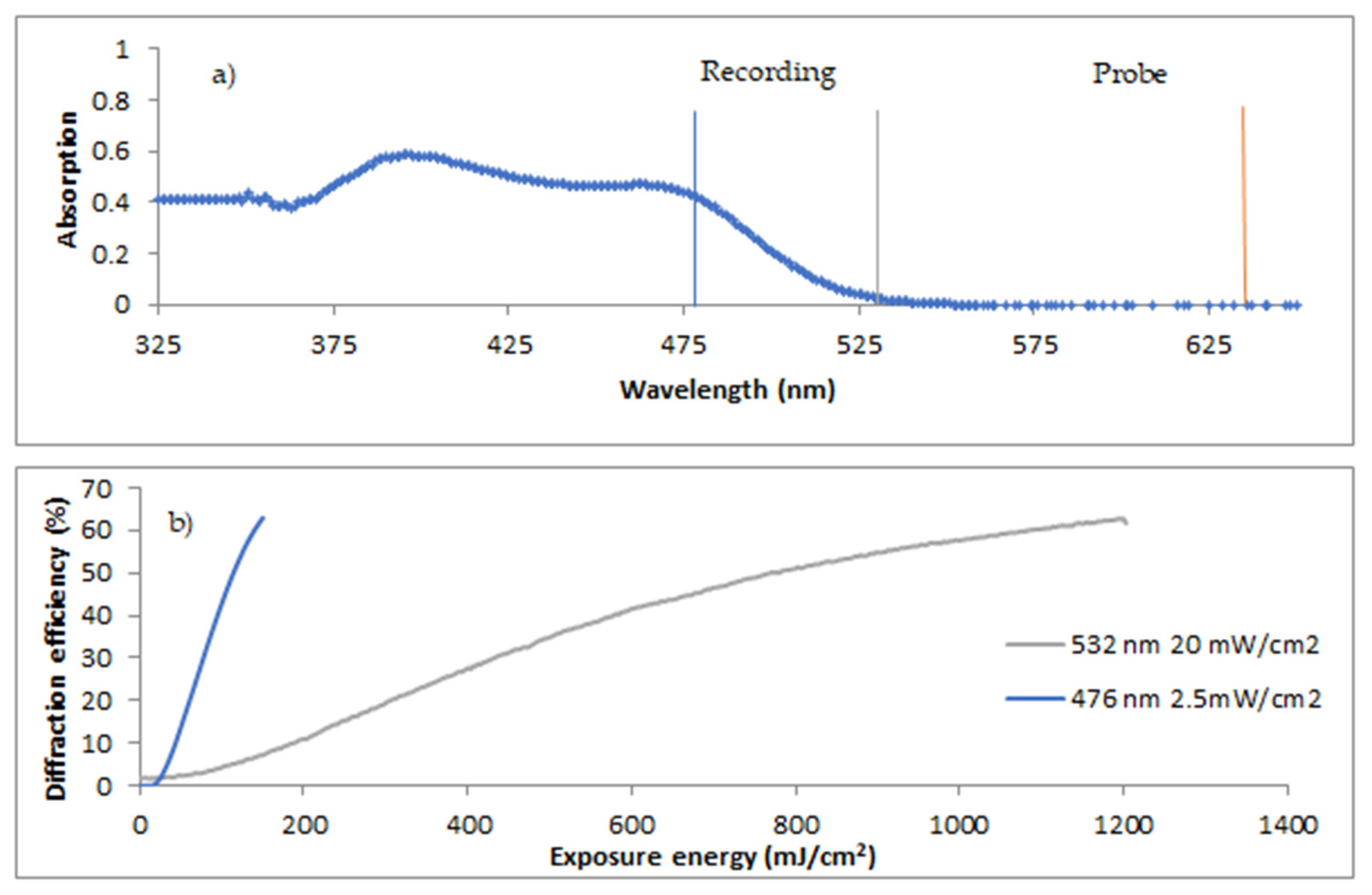 1 | Exposed to laser until diffraction efficiency peaked (60–100 s exposure) (1000 lines/mm) |