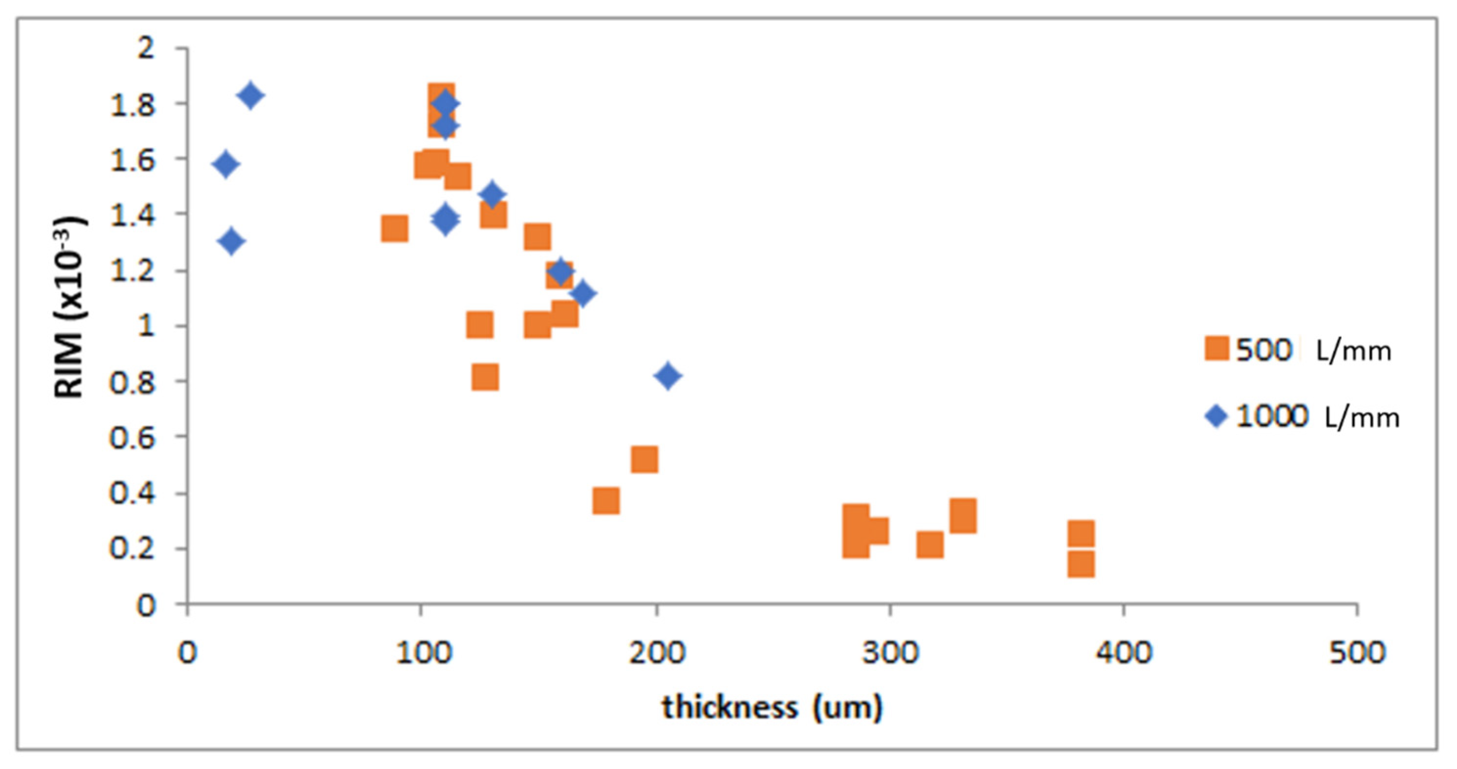 4.2. Determination of the RIM and Its Dependence on Thickness of the Layers at 500/1000 L/mm