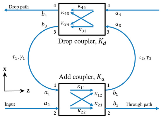 A circuit model for an add-drop ring resonator (RR), assuming single spatial mode propagation in all the paths external to the couplers, is illustrated schematically in Figure 1. The complex transmission matrices of the add coupler and drop coupler are defined by the following [33]: