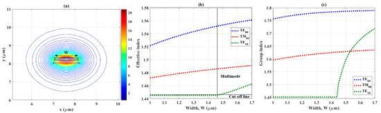 (a) Simulated transversal profile of the major electric field component Ex of the TE00 mode of the ADS waveguide, W = 1.1 μm is the top-width of the top stripe; (b) effective index variation, and (c) group index variation of first three modes with the width (W) of the waveguide.