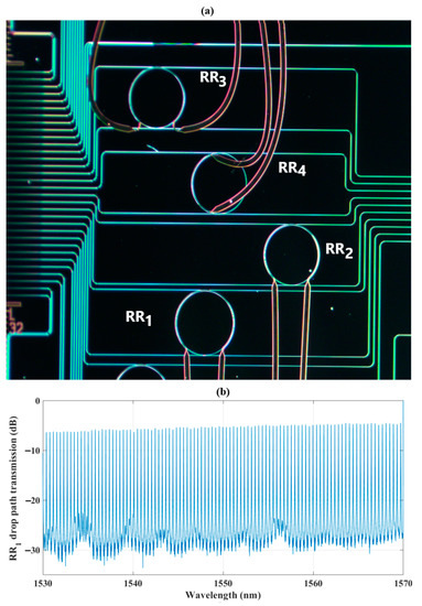 (a) Micrograph of different ring resonators. Each RR has the same radius, but different gaps. The minimum gaps of the ring waveguide and access waveguide are 1.2 μm, 1.5 μm, and 1.8 μm for RR1, RR2, RR3, and RR4, respectively. All rings are equipped with thermo-optic phase shifter heating elements, which cover almost the whole circumference of the ring waveguide except RR4, which covers less than half of the circumference; (b) measured drop path transmission spectrum of the RR1 over the whole C band.