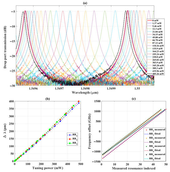 Figure 4a,b shows the tuning behavior of the fabricated ring resonators. A DC voltage is applied to the integrated phase shifters and the corresponding current is recorded. A tuning over the complete FSR can be achieved with a variation of the applied power from 0 mW to ~500 mW. Figure 4a depicts the drop path transmission spectra of RR1, which shows the shift of the resonant frequency over one FSR. Similar tuning behavior is observed for RR2, RR3, and RR5, which use an identical phase shifter configuration and thus provide similar linear I-V characteristics corresponding to a heater resistance of ~735 Ω. RR4 uses a phase shifter, which is shorter in length and, thus, has a lower resistance of ~375 Ω. Figure 4b shows that a similar linear dependence between the resonant wavelength shift and applied power is maintained for all phase shifter configurations.
