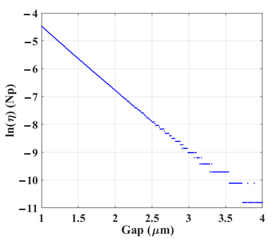 Natural logarithm of the integrand η (μm−1) from (21) vs. gap.