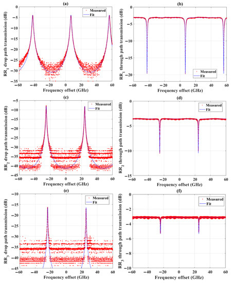 A good fit to the measured data, especially at the peak and notch of the drop path and through path transmission, is necessary to disentangle loss and coupling coefficients. Good fits have been achieved at the resonant peaks and notches for all rings, although departure at high extinction can be observed due to the noise floor of the measurement. Figure 6 shows the fitted spectra of drop- and through-path transmission alongside the measured data for RR1, RR2, and RR3.