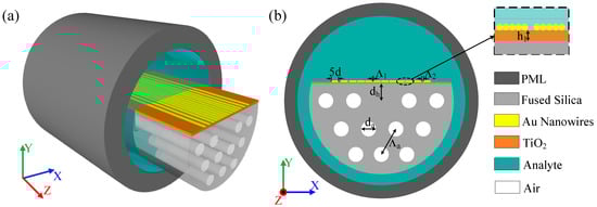 Figure 1 shows the fiber optic sensor structure model. The sensing plane is polished above the distance from the center of the fiber, a layer of TiO2 with thickness is first applied to the sensing plane, and then array of Au nanowire groups is placed on it, each of which is composed of five identical Au nanowires in close proximity. Each nanowire has same diameter of , and every fifth Au nanowire forms the Au nanowire group. In the sensing plane, there are 12 groups of Au nanowires forming an array of Au nanowire groups, with only the outermost and second outermost Au nanowire groups on both sides have a spacing of , and the other Au nanowire groups have a spacing of . The stomata in the fibers are arranged in a stacked manner, with the diameter of each air-hole being and the spacing of each air-hole being . The outermost layer of the fiber is an ideal cladding, which we can consider as a perfect match layer (PML).